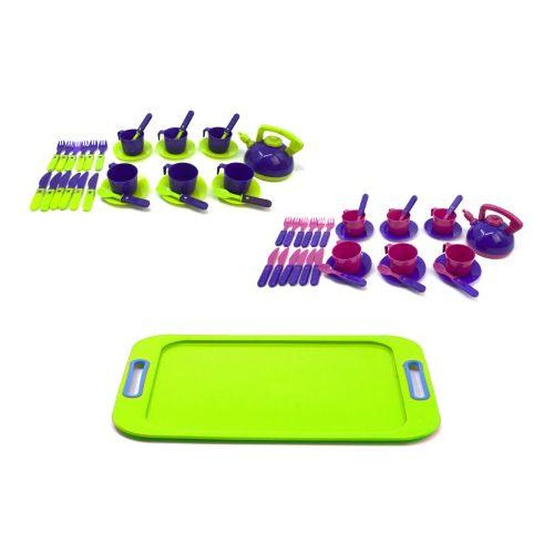 Посуда на 6 персон с подносом. Выполнена из качественного пластика. _ Бренд: Kinderway Упаковка: Сетка Цвет: Зелёный Вес в упаковке: 355 г Габариты в упаковке: 30 x 21 x 14 см Cтрана производитель: Украина Материал: Пластик Комплектация: Чашечки - 6шт; блюдца - 6шт; ножи - 6шт; вилки - 6шт; ложки - 6шт; чайник - 1шт; поднос - 1шт.