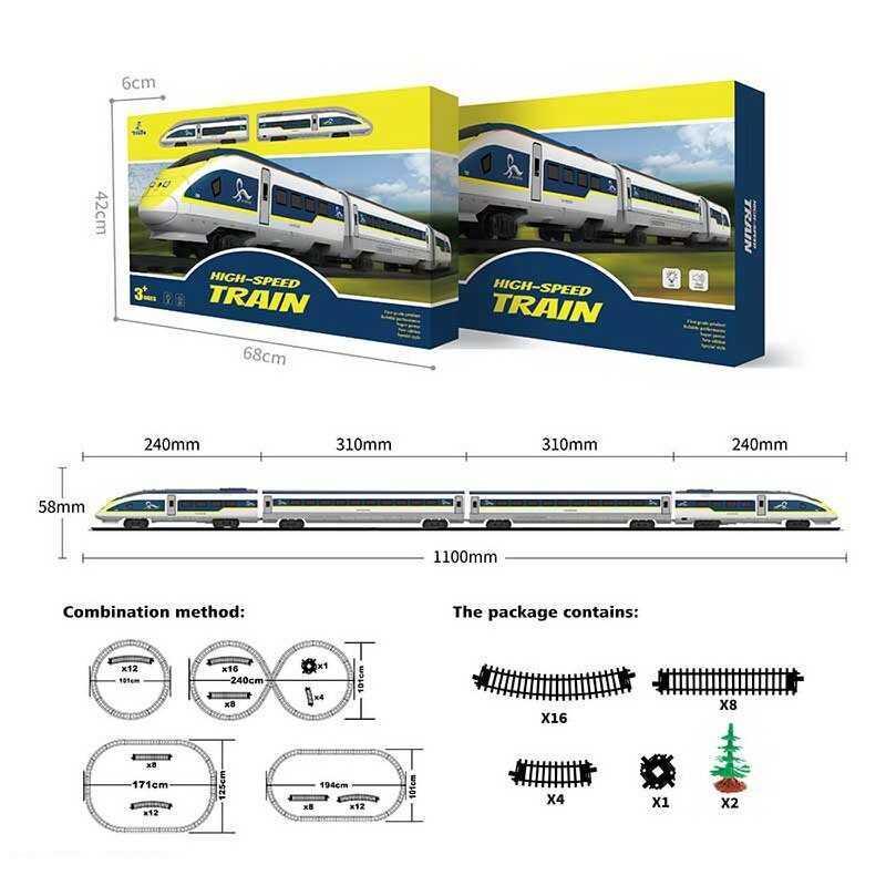 Високошвидкісний потяг "Залізнична пригода" Цей ігровий набір стане справжнім відкриттям для юних фанатів залізниць. Модель високошвидкісного потяга вражає своєю деталізацією та реалістичними елементами, які зроблять кожну гру незабутньою. Набір включає в себе: - Локомотив, що випускає захоплюючі звукові ефекти; - Три вагони, які надають потягу завершеного вигляду; - Набір рейок для побудови різних конфігурацій траси. Загальна довжина потяга становить 110 см, що забезпечує величезну ігрову площу. Рейки можна зібрати в декількох варіантах, що додає різноманітності та заохочує до творчого підходу у грі. Декоративні елементи, такі як дерева та дорожні знаки, роблять гру ще більш захопливою та реалістичною. Ця іграшка не лише розважає, але й сприяє розвитку уяви, дрібної моторики та інженерних навичок у дітей віком від 3 років. Включайте фантазію та створюйте свої залізничні пригоди!