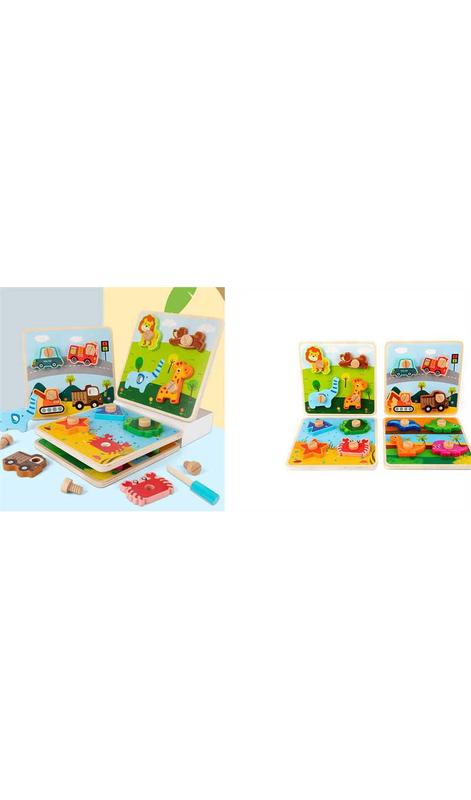 Интерактивная деревянная логическая доска с пазлами для детей Уникальная логическая доска C 60398 предлагает новый формат игры с пазлами для самых маленьких. Вместо классического вкладывания пазлы нужно прикручивать к тематической платформе с помощью безопасной отвертки, входящей в комплект. Яркие цвета и интересные формы способствуют развитию мелкой моторики и логического мышления у детей. - Тематическая платформа с четырьмя пазлами - Пазлы крепятся отверткой для развития координации - Компактные размеры и легкий вес для удобства игры - Безопасные игровые элементы без острых углов - Изготовлено из качественной древесины без вредных красителей