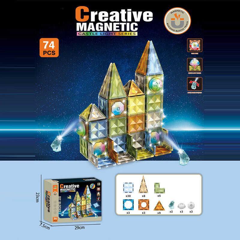 Магнітний конструктор для розвитку творчості Цей набір відкриває безмежні можливості для дитячої фантазії та креативної гри. У конструктора 74 деталі шести різних типів, які легко з'єднуються завдяки сильним магнітам. Яскраві елементи з підсвічуванням додають особливого шарму створеним моделям, дозволяючи будувати казкові замки, дороги, міста та інші об'єкти. Ключові характеристики: - 74 магнітні деталі різних форм - 6 типів конструктивних елементів - Підсвічування на 3 типах деталей - Батарейки для підсвічування включені у комплект - Розвиває просторове мислення, уяву та дрібну моторику