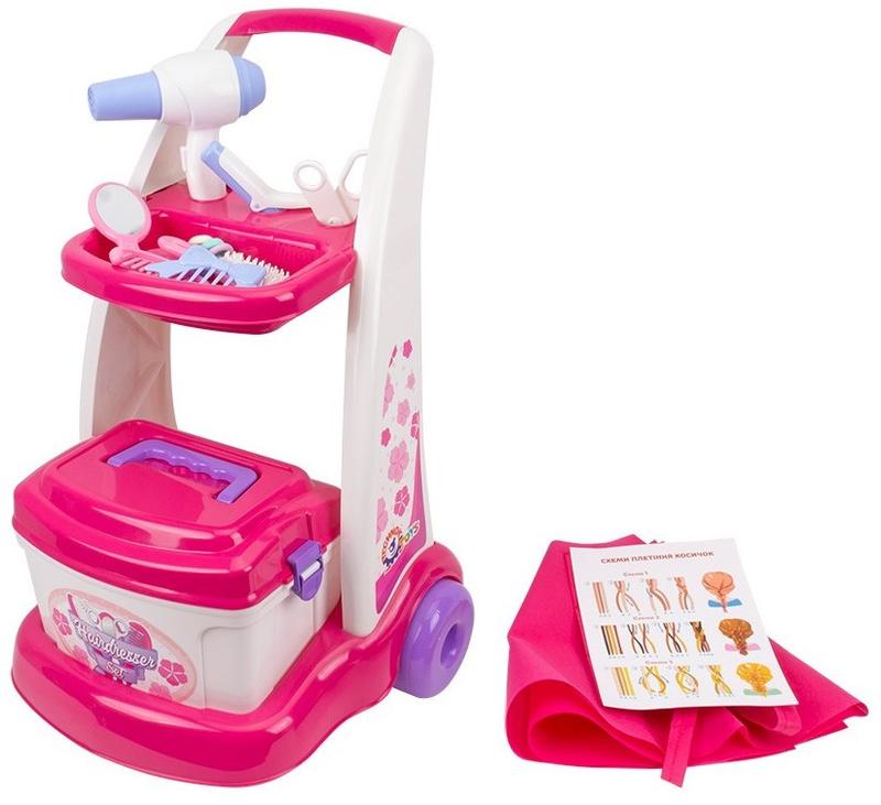 Собственный профессиональный салон красоты – мечта каждой девочки. Открыть такой маленьким модницам поможет " Набор парикмахера ТехноК" с вместительной саквояжей и маневровой тележкой. В салоне можно сделать прическу подружкам и мамочке, накрутить волосы куклам и просто припудрить носик. В наборе есть разные профессиональные инструменты на аксессуары. Для мастера- парикмахера – пояс с карманами, чтобы все инструменты были под рукой. Не испачкать одежду клиента поможет специальная накидка на защелке. В комплекте также есть расческа, щетка, плойка и шпилька в форме бантика для модной вьющейся прически. Зеркальце с ручкой, пинцет и пудреница всегда будут под рукой для идеального макияжа. А чтобы хорошо просушить волосы и сделать легкую укладку, следует использовать фен. Теперь у маленькой модницы все будет все как настоящая парикмахерская. Для идеальной праздничной прически пригодятся 6 резинок для волос и схема заплетки косичек. Такой набор принесет море радости маленьким модницам и сделает игры очень реалистичными. Размеры игрушечных принадлежностей оптимально рассчитаны для детских ручек. Также их удобно взять с собой на прогулку или в садик. Хранить и переносить парикмахерские инструменты можно в вместительном саквояже на защелках и на коляске. На нижней полке тележки есть специальное место для саквояжа, а на верхней полке с тремя крючками разместить мелкие элементы набора. Тележка удобная и маневровая, хорошо ездит на разных поверхностях, устойчива к опрокидываниям. С набором парикмахера от ТехноК каждая девочка почувствует себя настоящей профи парикмахерского дела! Сюжетно-ролевые игры развивают детское воображение, фантазию, мышление и мелкую моторику. Знакомят детей с основами гигиены и ежедневного ухода. Такие игры улучшают коммуникативные и социальные навыки. Игрушка изготовлена из прочного качественного пластика, без запаха. Комплектация : тележка, саквояж, фен, плойка, расческа, щетка, зеркальце, 2 заколки расческа, пудреница, пинцет, ножницы, накидка, пояс, 6 резинок для волос, инструкция для заплетания.