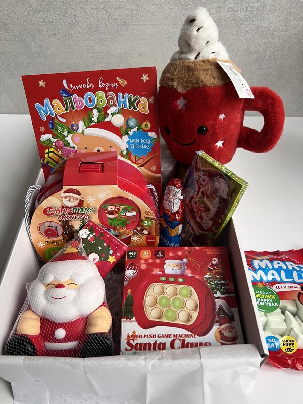 Дитячий подарунковий бокс Санта. В комплект входить: Сквіш Санта Pop-it Санта Ігровий набір в коробці (кухня) Мʼяка іграшка капучінко Водяна розфарбовка Смаколики(шоколад, маршмелоу, шоколадний санта)