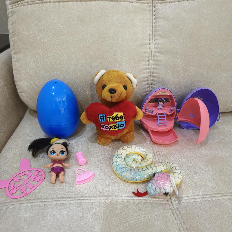 Набор детских игрушек для девочки. В идеальном состоянии. В набор входит: мягкая игрушка мишка на присоске, мягкая игрушка змея на присоске, куколка лолл с аксессуарами, кукольный домик в виде яичка. Цена 200 грн #viktoriya_bendova_tkachuk