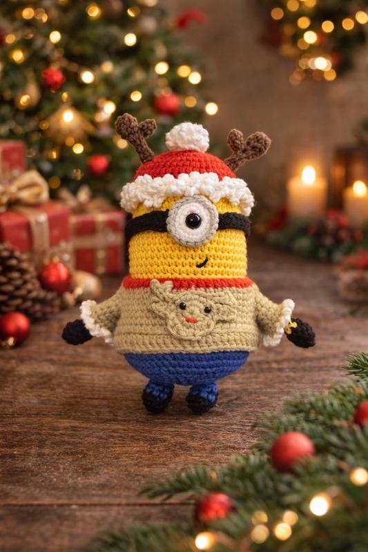 В’язана іграшка амігурумі “Міньйон у новорічному образі” Гарна, яскрава та повністю ручної роботи іграшка. Міньйон одягнений у святковий светр та шапочку у вигляді оленя. М’який наповнювач, приємна на дотик пряжа, акуратні шви. Ідеальний варіант для подарунка дитині, декору кімнати чи новорічного настрою. ✔ Висота приблизно: 12 см ✔ Матеріал: бавовняна пряжа, гіпоалергенний наповнювач ✔ Ручна робота, унікальний дизайн ✔ Стан: нова Підійде для колекціонерів, поціновувачів амігурумі або як оригінальний подарунок на свята.