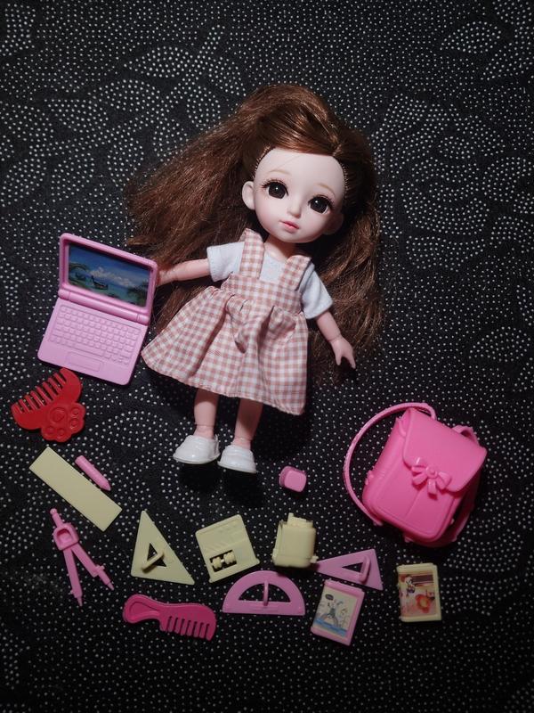 Полный школьный набор для игр включает: • Куклу с длинным каштановым волосами в клетчатом платье • Розовый рюкзак • Миниатюрный ноутбук с ярким экраном • Школьные принадлежности: линейки, транспортир, циркуль, карандаш • Мини-книжечки и тетради Состояние товара идеальное, все детали сохранены. Коробка имеет незначительные повреждения (видно на фото), но не влияет на качество игрушек. Идеально подходит для ролевых игр "в школу" и развития творческого воображения ребенка.