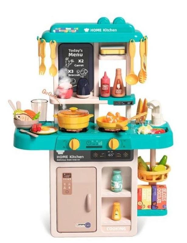 Детская кухня с водой и паром состоит из варочной поверхности с двумя конфорками с паром. Слева – столешница для обработки товаров, справа – мойка с краном, из которого течет вода. Под плитой расположен холодильник. Под мойкой есть открытые полочки. Конечно, над плитой есть стойка, имитирующая вытяжку, на которой есть крючки для кухонного начиния, полка для специй. Игрушка оснащена световыми и звуковыми эффектами. Кроме этого в наборе есть различные аксессуары: посуда, кухонные принадлежности, продукты, овощи, фрукты, еда и т.д. (Конечно же, игрушечные).В набор также входят досточка для рисования, мел, губка.Особенности Детская кухня с водой и паром:Игрушка оснащена световыми и звуковыми эффектами;В набор входят всевозможные аксессуары;Игрушка выполнена из качественных материалов.Характеристики Детская кухня с водой и паромТип питания: батареи;Количество предметов в комплекте: 53 шт;Размер кухни: 63 45,5 22см;Размер коробки: 49,5?35?14.5см.