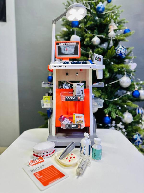 🎄НАБОР Доктора👩⚕️ 🧑⚕️ 🦷 Артикул:2606 💸цена:1280 грн 💸 Подарите ребенку возможность почувствовать себя настоящим стоматологом с игровым набором врача 👩⚕️🧑⚕️🏥 🥼Набор включает 26 реалистичных аксессуаров, среди которых - стетоскоп со звуком сердцебиения 🩺, термометр 🌡️ и смотровое зеркальце с подсветкой, безтеневая лампа с подсветкой 🌟 рентген-экран и модель челюсти зубы 🦷 Игровая тележка-трансформер легко превращается из медицинской тележки в стоматологическую, позволяющую придумывать множество сюжетов для игры. Все элементы изготовлены из прочного и безопасного пластика, а колесики на тележке обеспечивают удобное передвижение. Во время игры ребенок развивает воображение, мелкую моторику и коммуникативные навыки, больше узнавая о профессии врача и стоматолога. 🖇️Размеры: 33 - 30,5 - 68,5 см Светозвуковые эффекты приборов работают от батареек (входят в комплект).