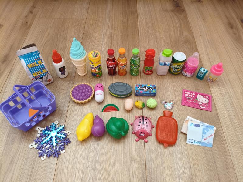Набор аксессуаров для игрушечной кухни или супермаркета. Маленькая корзина для покупок, игрушечные фрукты, овощи, бутылочки с напитками, игрушечная кредитка и деньги. Пакет молока помят, остальные игрушки в хорошем состоянии.