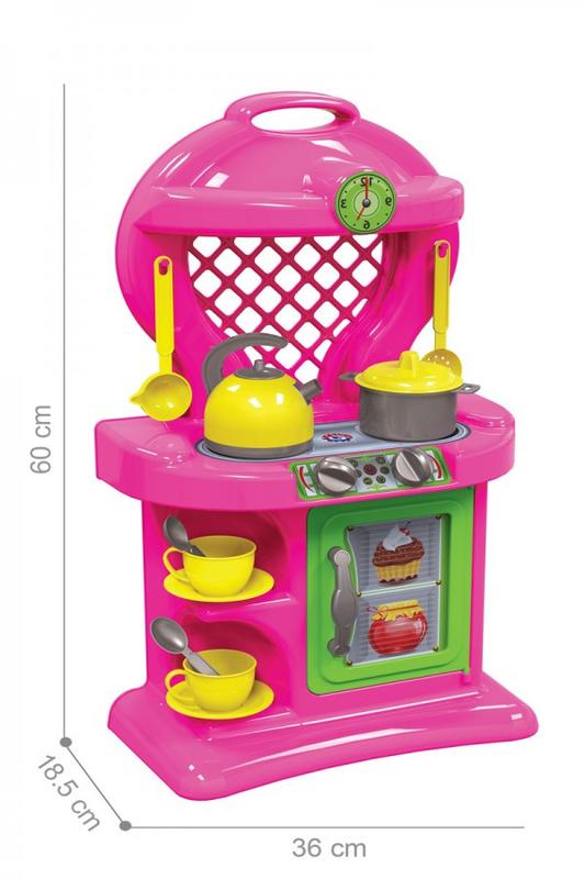 Кухня с плитой, духовкой, полками, вытяжкой. В набор также входят 2 чашки, кастрюля, чайник, кухонные принадлежности. Дверца духовки открывается. Игрушка упакована в картонную коробку.