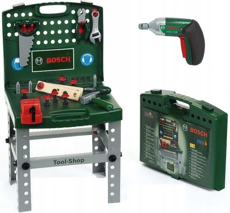 Мастерская Klein BOSCH 8686 Каждый маленький мальчик хочет почувствовать себя взрослым и делать то, что его папа. Теперь, благодаря мастерской Bosch (со звуками) это стало реальностью! Игровые наборы-мастерские от KLEIN способствуют развитию воображения и творческих способностей ребенка, и предоставят ему много часов незабываемого удовольствия! Характеристики детской мастерской Klein BOSCH 8686: - Набор сделан из высококачественных материалов, полностью безопасных для здоровья ребенка, очень крепкий и устойчивый (сделан немецкой компанией KLEIN по лицензии от корпорации Bosch, имеет все европейские сертификаты качества). - В комплект входят: - Молоток-гвоздодер - Отвертка. - Болты. - Шурупы. - Полосы с отверстиями для винтов. - Пила. - Плоскогубцы. - Разводной ключ. - Тиски. - Дрель на батарейках Bosch Ixolino (поворот влево / вправо, сменные насадки), батарейки 2х1, 5V R003 Micro тип AAA (в комплект не входят). - Удобный чемодан, который трансформируется в столик-верстак, с настенными креплениями для инструментов - чтобы легче было поддерживать порядок. - Размеры: - Размеры мастерской: 76 (В) см. - Размер упаковки: 9 ( Ш) х 42 (Д) х 37 (В) см. - Производитель рекомендует игрушку для детей от 3-х лет.