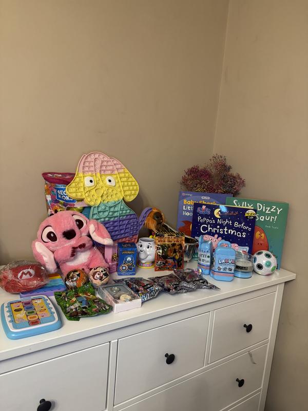 На зображенні показано асортимент дитячих іграшок та книжок, акуратно розкладених на білій шафі. М'які іграшки: Велика рожева плюшева іграшка, схожа на персонажа Стіча, розташована зліва. Також є менша іграшка з помаранчевим волоссям. Книги: Праворуч стоять три дитячі книги. Одна з них має назву "Peppa's Night Before Christmas" із зображенням свинки Пеппи та її родини. Інша називається "Silly Dizzy Saur!". Іграшки-антистрес (Pop-it): Велика жовта іграшка у формі собаки знаходиться позаду м'якої іграшки Стіча. Також є менша різнокольорова іграшка-антистрес внизу ліворуч. Інші предмети: В асортименті також присутні: Кілька невеликих коробочок та пакетиків із сюрпризами, зокрема з символікою Месників (Avengers). Дві дитячі пляшечки для води (одна синя з написом "LABUB"). Невелика біла чашка або тримач. Дві маленькі іграшкові футбольні м'ячі. Запакована іграшка в червоній сітці з персонажем Маріо.