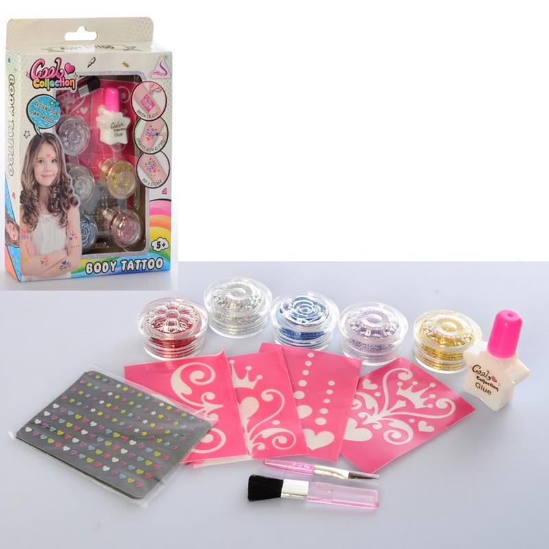 очень увлекательный творческий набор тату для юных модниц, размер упаковки 17,5-23-3 см. В набор входит специальный клей, который помогает фиксировать блесточки глиттер, тем самым создавая оригинальный орнамент на теле, который очень легко смывается и совсем не портит кожу. Чтобы создать рисунок, в набор входит 4 трафарета с разными узорами в форме завитушек, сердечек и кружков. Комплектация набора: - 4 трафарета; - наклейки; - клей; - 2 аппликатора; - 5 баночек с глиттером.