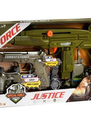 Військовий набір "Force set Power gun" стане чудовим подарунком вашій дитині. У наборі 7 елементів: пістолет зі звуковими ефектами, автомат-тріскачка, бінокль, годинник, рація, граната, свисток. Виготовлене з міцного та якісного пластику. Для дітей від 3 років.