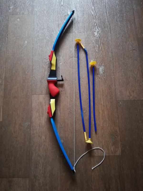 Б у, в хорошем состоянии. Нить натянута, играть и стрелять можно. Одна стрела только помялась, но это не проблема, для таких луков продаются отдельно стрелы, разные.