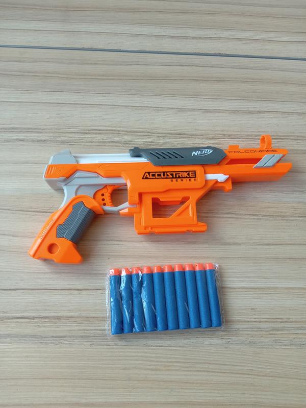 Бластер Nerf Аккустрайк Фалконфайр (Nerf AccuStrike FalconFire) від компанії Hasbro. Основна перевага цієї зброї - особлива влучність стрільби. Цьому посприяє зручний приціл, а також ручка, завдяки якій цей бластер буде максимально комфортно тримати в руках. NERF AccuStrike FalconFire компактний, тому з ним буде зручно активно пересуватися, можна ховатися і наносити удари по ворогу з укриття. Гра з таким бластером допоможе ефективно розвинути влучність, спритність, координацію рухів і зробить ігрову перестрілку з друзями по-справжньому цікавим і видовищним розвагою. Нижня частина бластера відведена під свого роду патронташ, куди буде зручно скласти деяку кількість патронів. Вік: Від 8 років В комплекті 10 нових патронів Стан дуже хороший Ціна: 300 грн