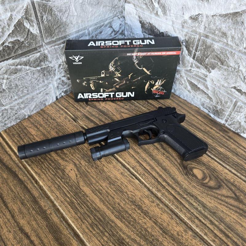 Детский пластиковый пистолет beretta vigor для 6 мм пуль c глушителем и лазерным прицелом...