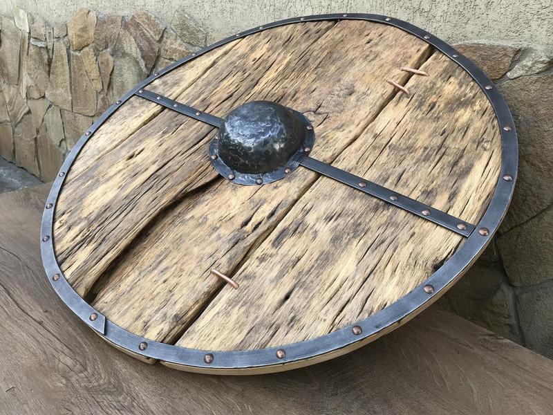 Ищете необычный щит ручной работы? Вот он! Размеры: - Диаметр: 75 см - достаточно большой щит Материалы: дерево (осина, дуб, ясень, сосна), железо, кожа, медь. Щит имеет вид изношенного с неровными краями дерева, с мелкими дырками и трещинами. Оформлен медными скобами, имеет металлическую ручку и кожаный пояс на тыльной стороне для ношения на руке. Ваш щит может выглядеть несколько иначе, чем на фото, поскольку он изготавливается из разной использованной/старой древесины. Несколько примеров щитов из различной древесины можно увидеть на фотографиях списка. Цена списка не включает гравировку/персонализацию. Хороший подарок для многих случаев! Это может быть лучшим функциональным произведением искусства и украшением в вашем доме!