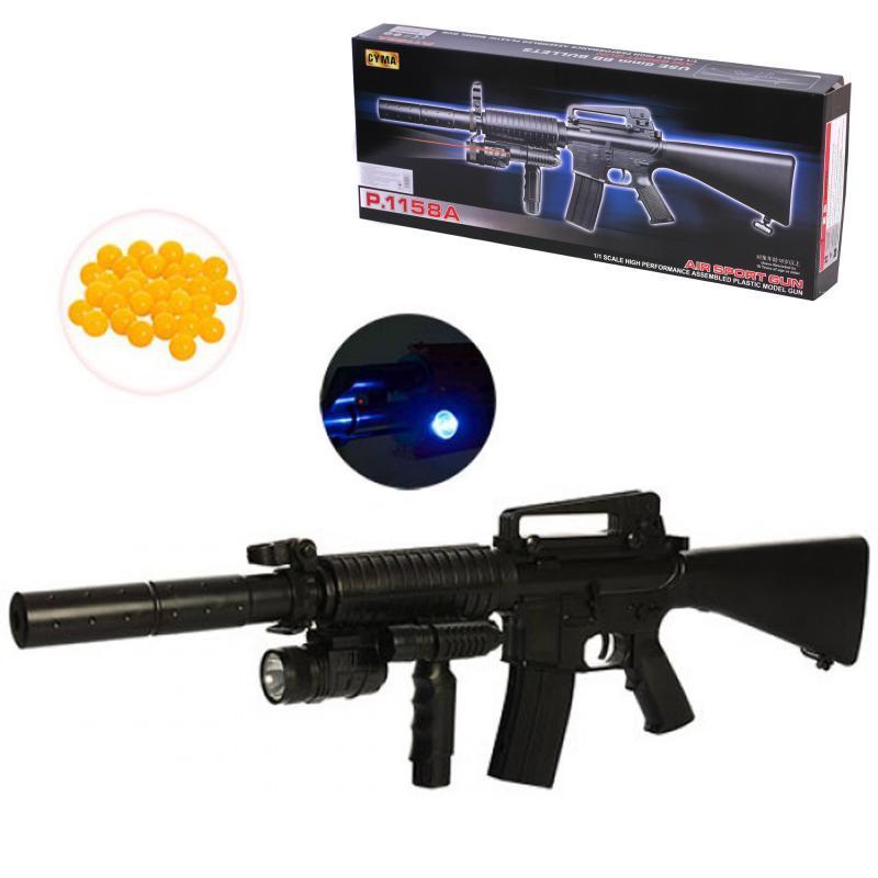 Іграшка "Автомат", 73 см. Лазерний приціл. Пластикові кулі в комплекті. Живлення - батарейки. Матеріал - пластик. Упаковка - коробка. Розмір - 60х7х23,5 см.