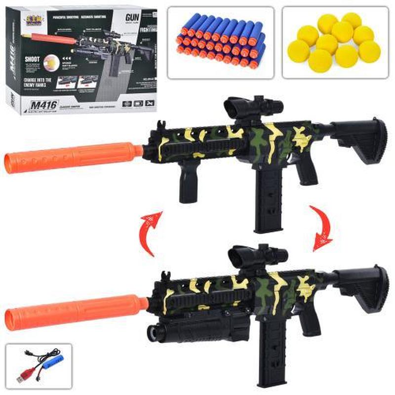 Іграшка "Автомат", 98 см. Стріляє м'якими кулями-присосками (30 шт), кульки 10 шт в наборі. Є помпа та оптичний приціл. Живлення - акумулятор. Матеріал - пластик. Упаковка - коробка. Розмір - 37х9х26 см.