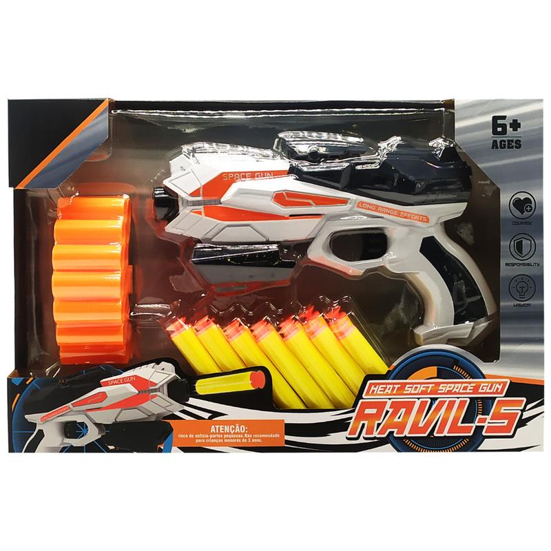 Стрельба производится большими безопасными патронами, которых 14 штук. Во время стрельбы надо будет затвор передёргивать вручную. Возраст: 6+ Размеры упаковки: 32х20,5х6 сантиметров. Комплект: пистолет, 14 мягких поролоновых пулек на присосках, чехол для ношения мягких пулек.