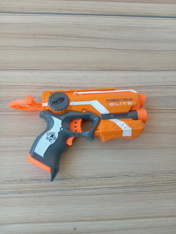 Бластер Фаер Страйк Элит Nerf Hasbro Это оригинальный пистолет с лазерным прицелом. Отлично стреляет даже при плохом освещении. Дальность полета патронов – до 20 метров. Лазерный прицел работает от 2 батареек. Бластер изготовлен из высококачественной пластмассы. Размер: 13 см Состояние очень хорошее Цена: 200 грн