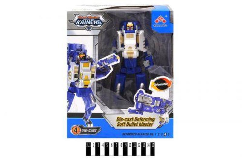 Причина уцінки: пошкоджена упаковка. Пластиковий робот-трансформер, який може трансформуватися в зброю: бластер, що стріляє поролоновими патронами з присосками, які йдуть в комплекті (8 шт.). Бренд: KAI LI TOYS Упаковка: Коробка Колір: Синій Вага з упаковкою: 800 г Габарити в упаковці: 32 x 13 x 25.5 см Габарити без упаковки: 32 x 13 x 26 см Країна виробник: Китай Матеріал: Пластик Комплектація: Робот-бластер, 8 патронів