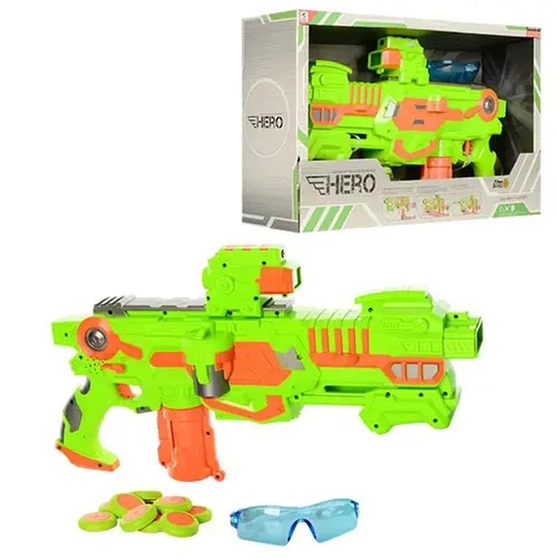 Игрушка должна понравиться мальчишкам — почитателям Hero, Звездных войн, и просто любителям перестрелок. Игрушка выполнена из высококачественного пластика, и сертифицированы по нормам SGS. Изделие рекомендовано для детей от 3-х лет и старше Игрушечный автомат-бластер 66807 абсолютно фантастическое оружие, фантазия производителей на мотивы Hero Factory. Это игрушечное оружие имеет размеры 50 х 27 х 12 см., продвинуто и необычно выглядит, умеет стрелять лазерными лучами и дисками. Оно генерирует световые и звуковые эффекты как настоящий артефакт из будущего. Диски-снаряды достаточно большие и мягкие чтобы беспокоиться о безопасности ребенка, но все-же в комплекте есть защитные очки которые предохранят глаза малыша от случайностей в игре. Комплектация: бластер — 1 шт. диски — 10 шт. очки — 1 шт. Размер упаковки: 59 х 28 х 14 см. Тип упаковки: коробка