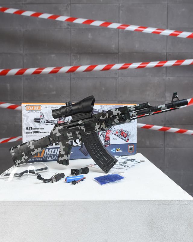 Этот автомат выполнен в стилистике популярных шутеров, таких как Counter-Strike и PUBG, и своим дизайном напоминает игровые «скинни», что обязательно привлечет внимание юных поклонников игр. Небольшие габариты делают модель удобной для детей, а комплектация включает все необходимые для безопасной игры, включая защитные очки, аккумулятор и зарядное устройство. Мини-автомат на орбизах позволяет детям познакомиться с механикой стрельбы, а для отработки навыков стрельбы можно дополнительно приобрести мишени. Использование орбизов (гидрокуль) делает игру безопасной и увлекательной, так как пули мягко разрушаются при попадании. Преимущества: * * Безопасная игра - используется мягкая гидрокуля, обеспечивающая безопасность при попадании. * Удобство и компактность - небольшой размер и легкость модели подходят для детей и позволяют носить автомат с собой. Полная комплектация - все необходимые аксессуары уже включены: автомат, защитные очки, аккумулятор, зарядное устройство пули орбиз.