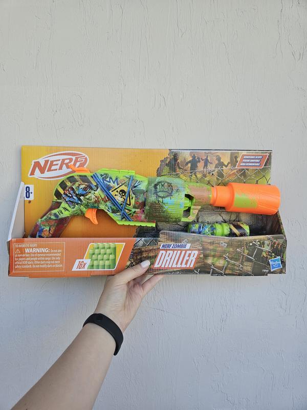 Бластер Nerf Zombie Driller приверне увагу кожного хлопчика, оскільки він прикрашений кольоровими графіті. Бластер виглядає як дриль, яку перетворили на бластер для боротьби з зомбі. Він чудово підходить для фанатів зомбі та є ідеальним аксесуаром для зомбі-вечірок. Іграшка має обертовий циліндр на 5 дротиків. У наборі: бластер; 16 дротиків; знімний приціл. Рекомендовано для дітей від 8-ми років.