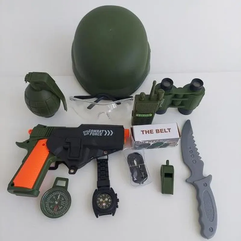 Военный набор пистолета в кобуре, шлем, очки, бинокль, часы, компас, жетон, граната, нож, в сетке (CH 222 A2) Маленькие спецагенты должны иметь свой набор, который поможет справиться с задачами разного уровня сложности. Он включает в себя личный пистолет в кобуре, бинокль для разведки, часы, защитный шлем, очки и компас, который поможет ориентироваться на новом месте. Не забыли и про металлический жетон на веревке. Набор станет отличным подарком для мальчиков, любящих сюжетные игры! Особенности: - все игровые элементы отличаются отличной детализацией и выполнены из первичного пластика; - в комплект входят пистолет, кобура, часы, компас, жетон на веревке, бинокль, защитные очки, шлем, рация, свисток, граната, нож, ремень; - набор имеет характерный военный цвет - хаки. Размер упаковки: 19 см × 14 см × 23 см Упаковка: Сетка Возраст: от 6 лет