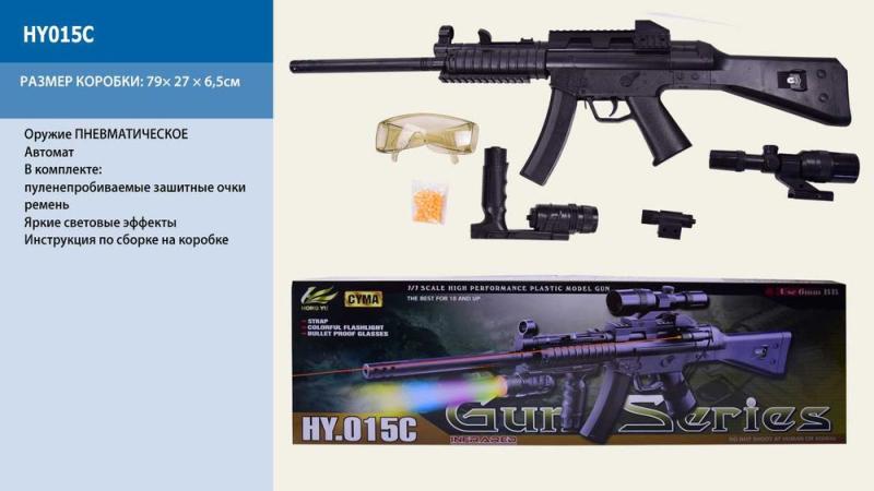 Автомат на шариках HY.015C — перед заказом, пожалуйста, уточайте наличие (оптовый состав). Детский автомат CYMA HY015C с пульками, лазер, свет, коробка 79 * 27 * 7 смАвтомат игрушечный пневматический CYMA HY015C этот игрушечный карабин-автомат на шариках сделан по образу реального оружия, предназначенной для вооружения спецподразделений. Выблюдается очень сильно реалистично как по детализации, так и по размерам, оснащен оптическим прицелом и стреляет стандартными 6 мм Пластиковые шарики. Дальность стрельбы до 25 метров.Напоминаем, что подобные игрушки, хотя и не могут нанести серьезный вред ребенку, предполагаются определенный возрастной ценнз.Эта игрушка рекомендуется для детей старше 12 лет.При вручении подарка проинструктируйте ребенка о правилах обращения с оружием.Батарейки не входят в комплект поставки.Вик: от 12 летДля мальчиков.Колир: Черный.Комплект: автомат, тактический фонарик, оптический и лазерный прицел, шарики.Размер упаковки: 80 х 27 х 7 см.Тип заряда: пластиковые шарики 6 мм