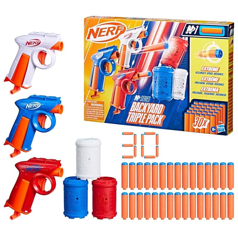 Тройной набор Hasbro NERF N Series Backyard Pack — это всё, что нужно, чтобы начать захватывающую битву с семьёй и друзьями — в саду, на пляже или в парке. Приготовьтесь к невиданным ранее летним сражениям! Внутри коробки вы найдёте три компактных бластера Nerf, тридцать революционных стрел N1 и три отдельно стоящие мишени. Каждый бластер вмещает один дротик, который заряжается спереди. Использовать бластер просто: зарядите, потяните за рычаг и стреляйте. Инновационные дротики серии N из пеноматериала разработаны для максимальной точности , скорости и дальности — они сделают вас лидером в любой битве Nerf! Этот набор идеально подойдёт как начинающим воинам Nerf, так и более опытным игрокам, желающим вывести свои игры на новый уровень. Он также станет отличным подарком для братьев и сестёр! Состав набора: 3 пусковых установки Flex Blaster (примерно 11 x 14 см) 30 стрел серии N 3 ствола