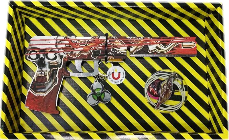 В комплекте сам резинкострел в форме пистолета USP . брелок SO2, который пристает к пистолету и 3 шт. наклейки, которые можно клеить на пистолет Отличный подарок для мальчиков.