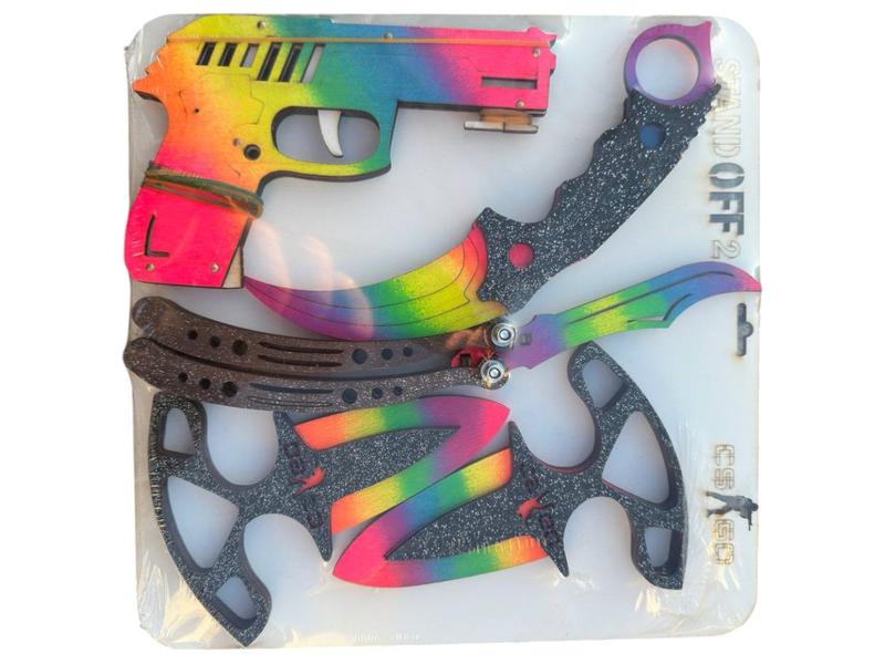 Характеристики та опис - - Країна виробник Україна - Вікова група Від 4 років - Матеріал Дерево - Колір Різні кольори Набір дерев'яної зброї CS-GO . Гарний набір дітям для ігор. Ножі безпечні для дітей. Не заточені, порізатися неможливо. Виготовлені з дерев'яної фанери. Ціна за набір 5 шт. . Характеристика: