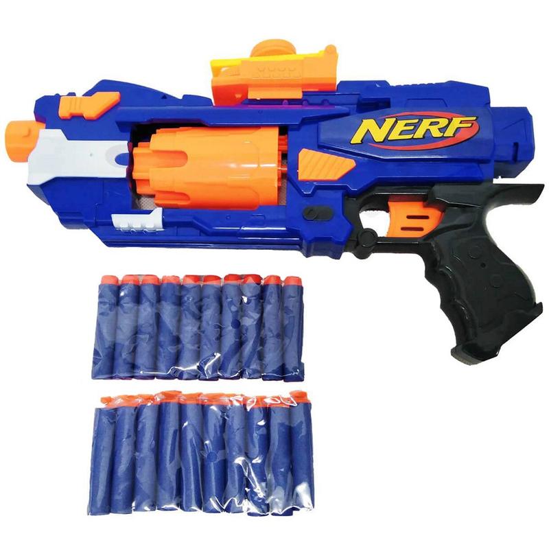 Игрушечный бластер Нерф оснащен барабаном, в который можно зарядить 7 патронов. В комплекте 2 вида мягких патронов, 10 на присосках и 10 пластмассовым наконечником. Работает бластер от 3 батареек типа АА (в комплект не входят). Дальность выстрела 8 - 10 метров. Размер бластера 33 * 5 * 18 см. Размер коробки 34.5 * 6,5 * 22 см.