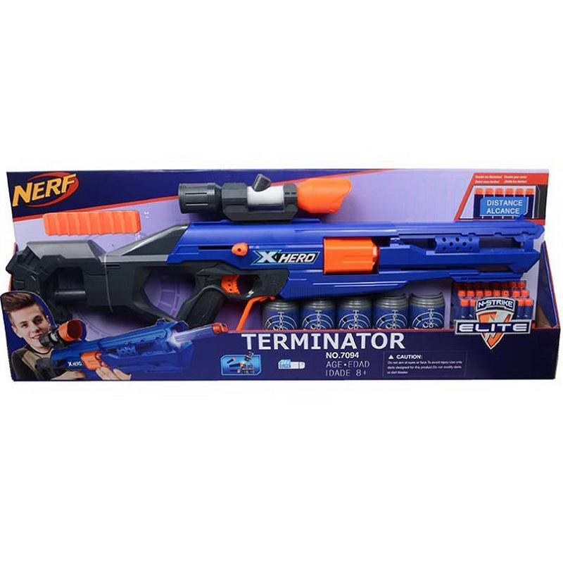 Бластер Nerf Terminator имеет эргономичный и яркий дизайн. Принцип работы: сбоку есть рычажок, которым перезарядил -- выстрелил, перезарядил -- выстрелил. В наборе: бластер со снайперским прицелом (муляж), 5 банок - мишеней, 24 мягких поролоновых патронов, которые легко найти после выстрела. Размер бластера 76 * 24 см. Размер коробки 79 * 7 * 29 см.