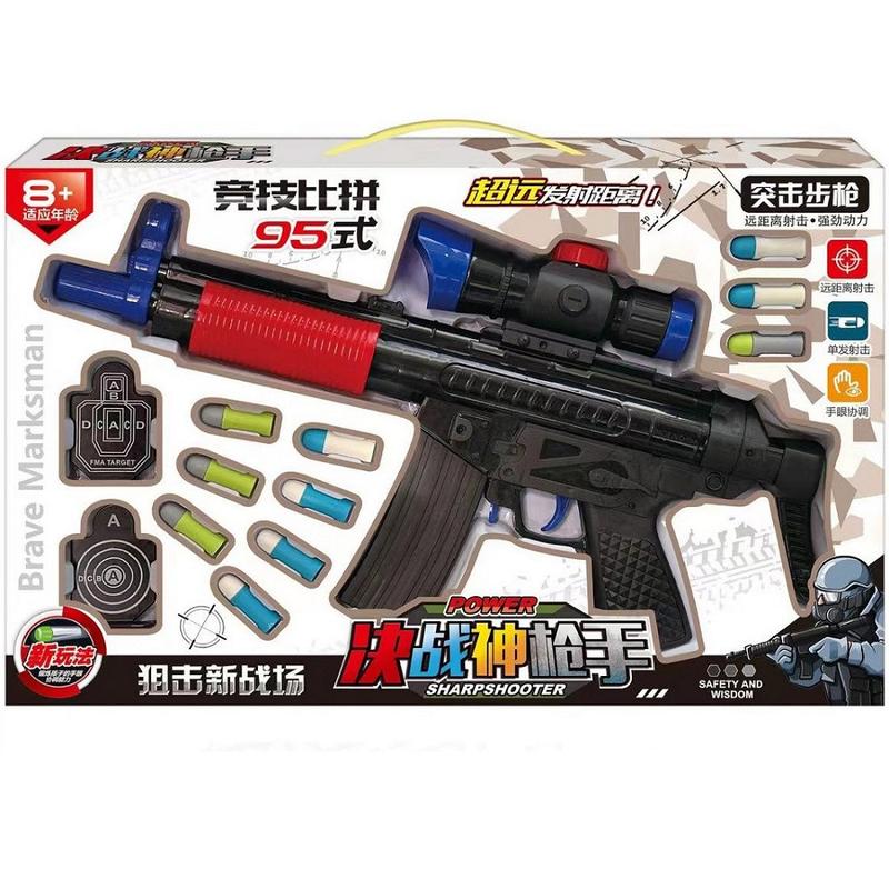 Дитячий автомат із м'якими кулями новинка в нашому онлайн-магазині. У комплекті: автомат, 10 куль, 2 мішені. Розмір коробки 42.5 * 5.5 * 27 см.