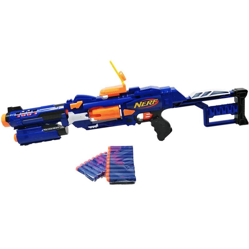 Бластер автомат Nerf это футуристический автомат стреляющий поролоновыми пулями на присосках. Автомат необходимо зарядить, барабан на 7 поролоновых патронов. Переведи переключатель на корпусе в положение ON, после этого, барабан начнёт крутиться и при нажатии на спусковой крючок, автомат будет выстреливать патроны. В комплекте 2 вида мягких патронов, 10 на присосках и 10 пластмассовым наконечником. Работает бластер от 3 батареек типа АА (в комплект не входят). Дальность выстрела 8 - 10 метров. Бластер оснащен лазером. Размер бластера 71 * 5 * 18 см. Размер коробки 74 * 6,5 * 22 см.