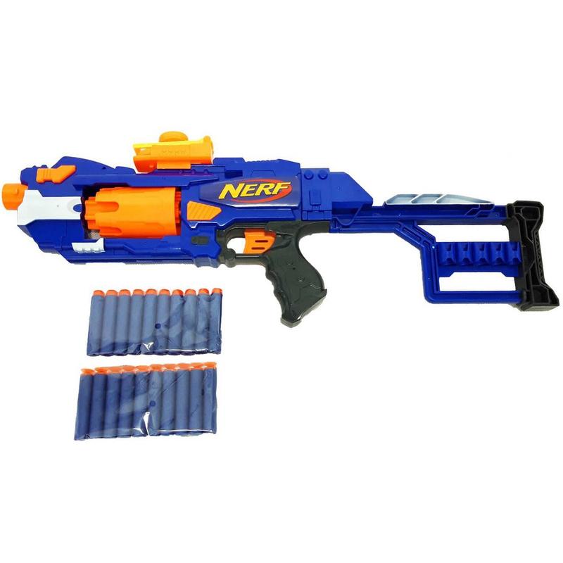 Оружие может вести автоматическую стрельбу и оснащено вместительным барабаном, в который можно зарядить 7 патронов. В комплекте 2 вида мягких патронов, 10 на присосках и 10 пластмассовым наконечником. Работает бластер от 3 батареек типа АА (в комплект не входят). Дальность выстрела 8 - 10 метров. Размер бластера 55 * 5 * 18 см. Размер коробки 56 * 6,5 * 22 см.