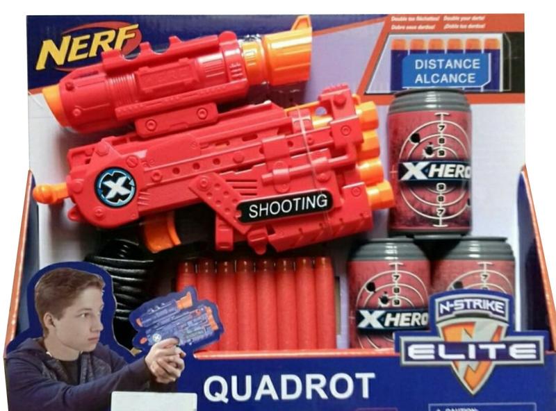 Четырёх -- ствольный бластер с прицелом очень прост в использовании и с ним легко справится даже неопытный боец. Чтобы взвести пружину, нужно просто оттянуть Т-образный оранжевый рычаг назад до щелчка. При нажатии на спусковой крючок произойдёт одиночный выстрел. В комплекте: бластер с прицелом, 3 полу -- банки мишени и 8 стрел. Размер коробки 33 * 6 * 28 см.