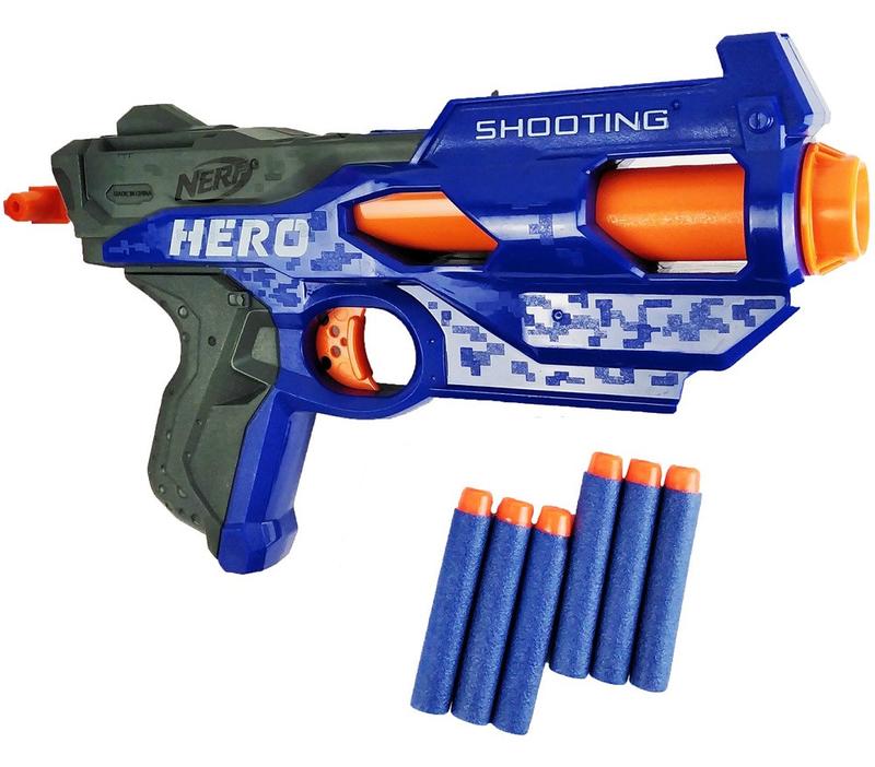 Бластер Nerf Hotshock - это небольшой, простой бластер с держателем для одной дополнительной стрелы. Стрелы загружаются в ствол прямо со стороны дула, пружина взводится Т - образным рычагом с тыльной стороны. Хот Шок может выстрелить на дальность 15 метров - это стандартный показатель для пистолетов Nerf. Благодаря простоте в обращении этот бластер подойдёт даже новичкам - в его конструкции нет ничего лишнего и сложного, ребёнок легко справится с ним даже без инструкции. В комплекте 6 стрел. Размер коробки 29 * 5 * 20 см.