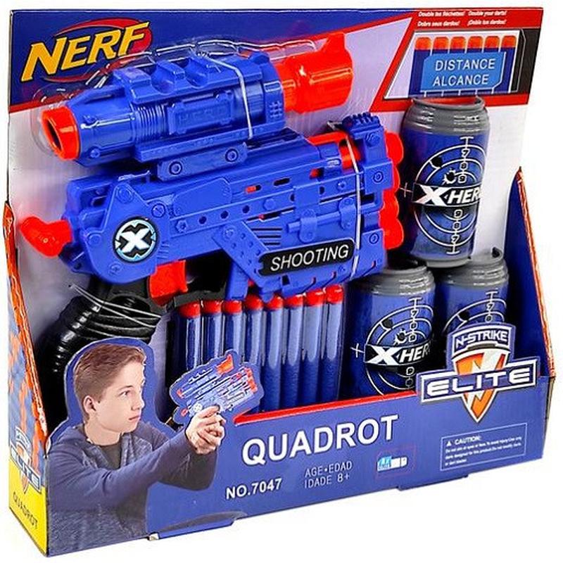 Чотири — дульний бластер із прицілом дуже простий у використанні та з ним легко впорається навіть недосвідчений боєць. Щоб звести пружину, потрібно просто відтягнути Т-подібний жовтогарячий важіль назад до клацання. Під час натискання на спусковий гачок станеться одиничний постріл. У комплекті: бластер із прицілом, 3 підлоги — банки мішені та 8 стріл. Розмір коробки 33 * 6 * 28 см.