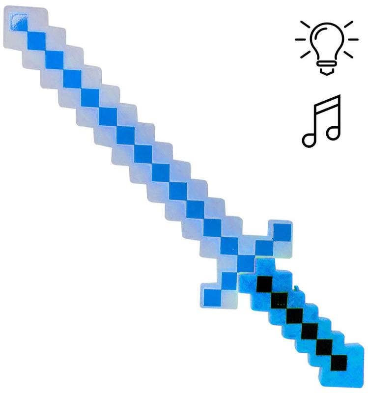 Меч "Minecraft" выглядит в стилистике компьютерной игры. Оснащен световыми эффектами светится разными цветами, издает звуки удара об меч соперника при нажатии на кнопочку. Работает от 3 батареек типа АА (не входят в комплект). Размер меча 58 * 2 * 14 см.