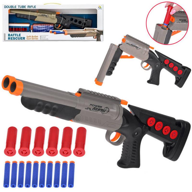 Этот фантастический дробовик -- настоящее удовольствие для каждого любителя стрельбы. Большое игрушечное ружье с мягкими патронами в красивой расцветке и оригинальном дизайне. Система отстреливания гильз, выстрел из двух стволов, дополнительные слоты для патронов в прикладе. Для начала подготовим пули -- вставим патроны в гильзы. К счастью, их несколько, так что можно запастись! Затем нажимаем оранжевую кнопку на стволе ружья, чтобы он открылся наполовину. Тянем ствол вниз, пока не услышим четкий щелчок (90°). Вкладываем в ствол две подготовленные пули и поднимаем ствол, закрывая его, пока не услышим щелчок. Готово! Теперь просто нажимаем на курок. Если мы сделаем это слегка, то выстрелим одной пулей. Если нажмем на курок сильнее, то выстрелят обе одновременно! Во время следующей загрузки, после открытия ствола, будут выпадать пустые гильзы, что делает игру очень реалистичной! В наборе: оружие, 6 гильз, 10 мягких патронов. Дальность стрельбы 8 метров. Размер оружия 51 * 6 * 15 см. Размер коробки 58 * 7.5 * 21 см.
