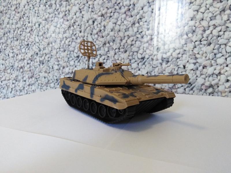 Кузов танка, катки, гусеницы – пластмасса. Длина танка – 19 см. Вращается башня вокруг своей оси (360 градусов) Пулемет на башне вращается вокруг своей оси (360 градусов). Ствол поднимается до 0,5 см. Танк двигается благодаря колесам под гусеницами. Упаковка – заводская коробка.