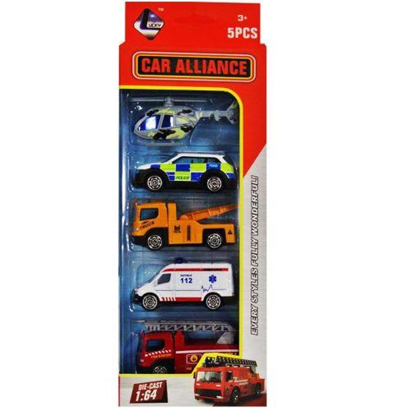 Набор транспорта. В комплект входят вертолет, полицейская машина, тягач, фургон скорой помощи и пожарная машина. У вертолета крутится винт, у тягача и пожарной машины поднимается кран. Изготовлено из пластика и металла. Набор отлично подойдет для веселых игр. Размеры 1:64.