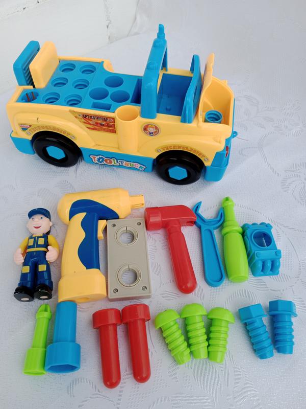 Машинка-конструктор Huile toys со световыми и звуковыми эффектами желто-голубого цвета. В набор входит: 1) Фигурка водителя 2) Дрель-шуруповерт-гайковерт крутится на бетерейках. 3) Молоток 4) Отвертка 5) Гаечный ключ 6) Два разных наконечника для шуруповерта 7) 3 шурупа 8) 6 болтов 9) 2 цвяха 10) Крепежная пластина. Все работает.