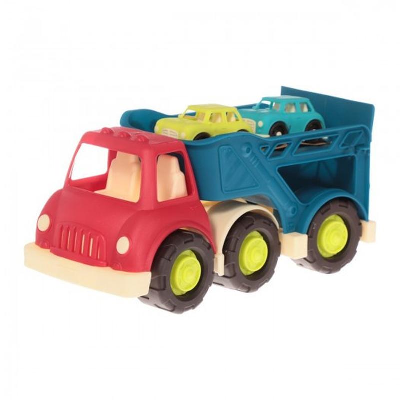 Біп, біп... Ваша доставка двох дитячих машинок вже тут! - Автовоз з 6 колесами! Великий і міцний 6-колісний іграшковий автовоз з 2 маленькими іграшковими машинками порадує будь-якого малюка. - 2 рівня! Завантажте свої автомобілі в дитячій і відвезіть їх на кухню. Вивантажуйте! - З'ємний причіп повертається під час руху. Задні двері відкриваються, перетворюючись на вантажну рампу. Верхня платформа опускається для завантаження автомобілів. Розмір іграшки: 34 x 20 x 18 cm. Розвиваючі іграшки Battat - Будь веселим! Будь захопленим! Будь собою! Рекомендовано для дітей у віці старше 1 року.