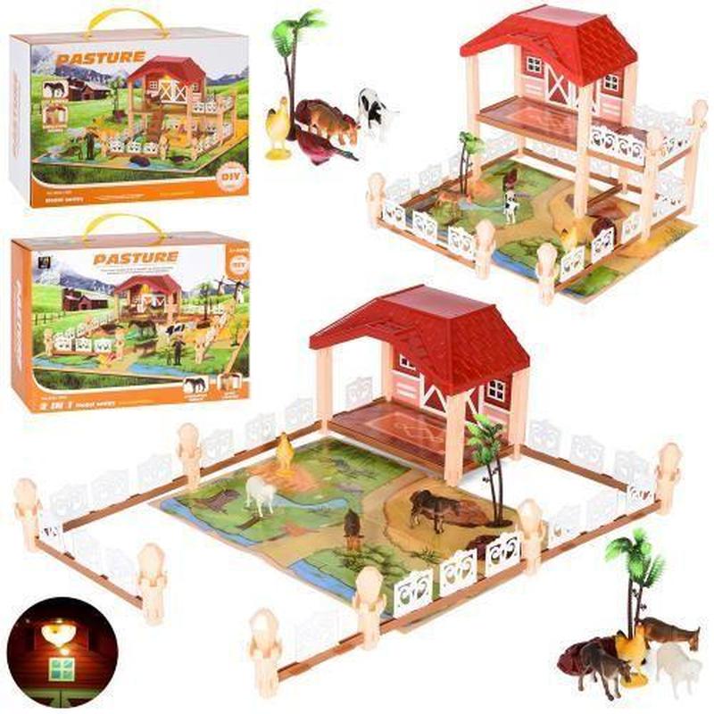 Игрушечная ферма. В набор входят пластиковые и картонные детали для дома и забора, пластиковые животные, фермер и пальмы и светящаяся лампа. Понравится творческим детям, которые любят что-то строить, складывать. Набор смотрится очень ярко и изготовлен из качественных материалов._