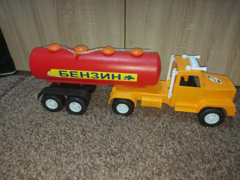 Бензовоз. Є пошкодження, видно на фото. На гру не впливає. Дитина через дирочки на бочці, повкидала маленькі іграшки, довелось робити надріз, щоб дістати.